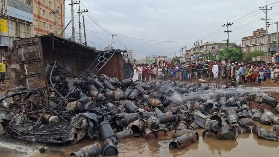 মহাসড়কে ২শ সিলিন্ডারসহ উল্টে গেল ট্রাক, একের পর এক বিস্ফোরণ