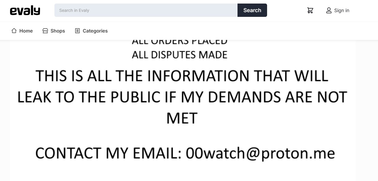 সাইটটিতে গেলে লেখা দেখা যাচ্ছে, HACKED, I HAVE ALL CUSTOMER DATA. EVALY STAFF PLEASE CONTACT 00watch@proton.me. OR ELSE I WILL RELEASE THIS DATA TO THE PUBLIC.