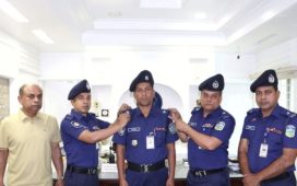 পদোন্নতি প্রাপ্ত পুলিশ সদস্যকে র্যাংক ব্যাজ পরালেন শেরপুরের পুলিশ সুপার
