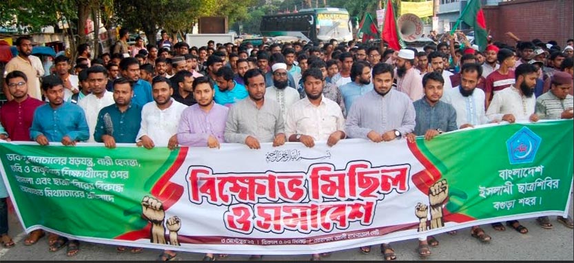ডাকসু নির্বাচন বানচালের ষড়যন্ত্র, নারী হেনস্তা, চবি ও বাকৃবিতে শিক্ষার্থীদের ওপর হামলা এবং ছাত্রশিবিরের বিরুদ্ধে অব্যাহত মিথ্যাচারের প্রতিবাদে বগুড়ায় বিক্ষোভ মিছিল ও সমাবেশ করেছে বাংলাদেশ ইসলামী ছাত্রশিবির শহর শাখার নেতৃবৃন্দ। বুধবার বিকেল সাড়ে ৫টায় বিক্ষোভ মিছিলটি মোহাম্মাদ আলী হাসপাতাল মোড় হতে শুরু হয়ে সাতমাথায় গিয়ে শেষ হয়।