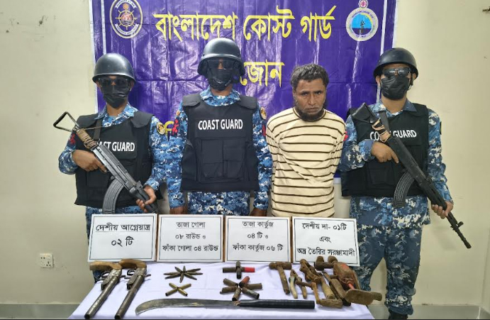 তিনি বলেন, গোয়েন্দা তথ্যের ভিত্তিতে গত ২৭ নভেম্বর বৃহস্পতিবার সন্ধ্যা ৭টায় কোস্ট গার্ড স্টেশন মহেশখালী কর্তৃক কক্সবাজারের মহেশখালী থানাধীন কেরুনতলী সংলগ্ন গহিন পাহাড়ে একটি বিশেষ অভিযান পরিচালনা করা হয়। অভিযান চলাকালীন উক্ত এলাকা হতে ২ টি দেশীয় আগ্নেয়াস্ত্র, ৮ রাউন্ড তাজা গোলা, ৪ রাউন্ড ফাঁকা গোলা, ৪ রাউন্ড তাজা কার্তুজ, ৬ রাউন্ড ফাঁকা কার্তুজ, ১ টি দেশীয় অস্ত্র ও বিপুল পরিমাণ আগ্নেয়াস্ত্র তৈরির সরঞ্জামাদি সহ ১ জন আগ্নেয়াস্ত্র তৈরির কারিগরকে আটক করা হয়।