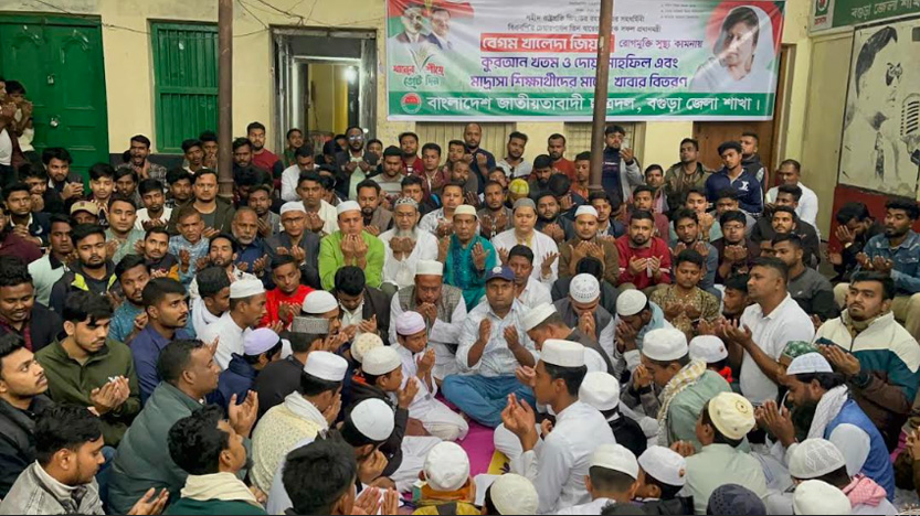 বিএনপি চেয়ারপার্সন ও সাবেক প্রধানমন্ত্রী বেগম খালেদা জিয়ার রোগমুক্তি ও সুস্থতা কামনায় বগুড়ায় কুরআন খতম, দোয়া মাহফিল এবং মাদ্রাসা শিক্ষার্থীদের মাঝে খাবার বিতরণ করা হয়েছে। সোমবার বাদ আসর জেলা ছাত্রদলের আয়োজনে শহরের নবাববাড়ি সড়কের দলীয় কার্যালয়ে এ আয়োজন করা হয়।