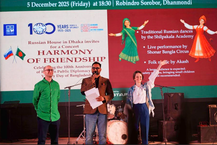 রুশ জনগণের গণ-কূটনীতির শতবর্ষ এবং বাংলাদেশের বিজয় দিবস উপলক্ষে ঢাকায় রাশিয়ান হাউসের আয়োজনে এক বর্ণাঢ্য সাংস্কৃতিক কনসার্ট অনুষ্ঠিত হয়েছে। শুক্রবার সন্ধ্যায় ঢাকার মুক্তমঞ্চ রবীন্দ্র সরোবরে জমকালো এই আয়োজনে প্রায় ১৩ হাজারের বেশি দর্শক অংশগ্রহণ করেন।