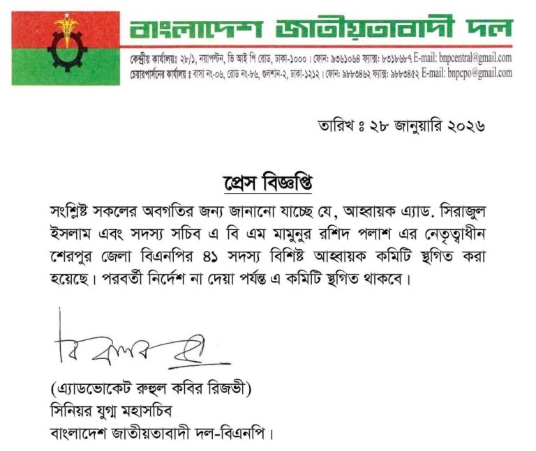 বিজ্ঞপ্তিতে বলা হয়- আহ্বায়ক অ্যাডভোকেট সিরাজুল ইসলাম এবং সদস্য সচিব এ বি এম মামুনুর রশিদ পলাশের নেতৃত্বাধীন শেরপুর জেলা বিএনপির আহ্বায়ক কমিটি স্থগিত করা হয়েছে।