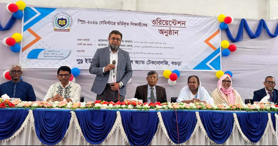 বগুড়ায় পুন্ড্র ইউনিভার্সিটি অব সায়েন্স অ্যান্ড টেকনোলজিতে স্প্রিং ২০২৬ সেমিস্টারে ভর্তিকৃত শিক্ষার্থীদের ওরিয়েন্টেশন অনুষ্ঠিত হয়েছে। শনিবার সকালে বিশ্ববিদ্যালয় অডিটোরিয়ামে নবীন শিক্ষার্থীদের এই আয়োজনে প্রধান অতিথি হিসেবে বক্তব্য রাখেন বগুড়া বিজ্ঞান ও প্রযুক্তি বিশ্ববিদ্যালয়ের উপাচার্য অধ্যাপক ড: কুদরত ই-জাহান।