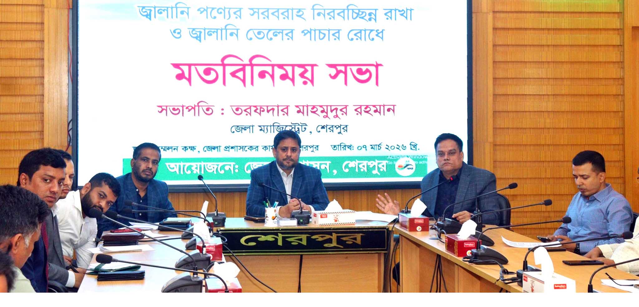শেরপুরে জ্বালানি পণ্যের সরবরাহ নিরবচ্ছিন্ন রাখা ও জ্বালানি তেলের পাচার প্রতিরোধে জ্বালানি পাম্প মালিক, সরবরাহকারী, ব্যবসায়ী, পুলিশ ও জেলা প্রশাসনের অংশগ্রহণে এক মতবিনিময় সভা অনুষ্ঠিত হয়েছে। ৭ মার্চ শনিবার সকালে জেলা প্রশাসকের সম্মেলন কক্ষ রজনীগন্ধায় আয়োজিত ওই সভায় সভাপতিত্ব করেন জেলা প্রশাসক ও জেলা ম্যাজিস্ট্রেট তরফদার মাহমুদুর রহমান।