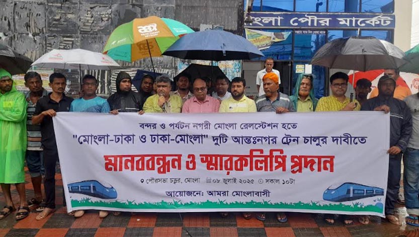 বন্দর ও পর্যটন নগরী মোংলার রেল স্টেশন হতে “মোংলা-ঢাকা ও ঢাকা-মোংলা” দুটি আন্ত:নগর ট্রেন চালুর দাবিতে মোংলায় মানববন্ধন ও রেলপথ মন্ত্রণালয়ের উপদেষ্টা বরাবর স্মারকলিপি প্রদান করা হয়েছে। ৮ জুলাই মঙ্গলবার সকালে পৌরসভা চত্বরে আমরা মোংলাবাসী ব্যানারে এ মানববন্ধন কর্মসূচি পালন করা হয়।