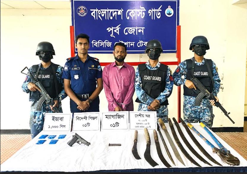 তিনি বলেন, গোপন সংবাদের ভিত্তিতে ৩১ আগস্ট রবিবার দুপুর ১ টা ৩০ মিনিটে কোস্টগার্ড স্টেশন টেকনাফ ও পুলিশের সমন্বয়ে টেকনাফ থানাধীন রাজারছড়া সংলগ্ন এলাকায় একটি যৌথ অভিযান পরিচালনা করা হয়। অভিযান চলাকালীন উক্ত এলাকায় তল্লাশি চালিয়ে ১ টি ৭.৬২ মিঃ মিঃ বিদেশী পিস্তল, ৯ টি দেশীয় অস্ত্র ও প্রায় ৫ লক্ষ টাকা মূল্যের ১,০০০ পিস ইয়াবাসহ একজন কুখ্যাত সন্ত্রাসী ও মাদক কারবারীকে আটক করা হয়। জব্দকৃত আলামত ও আটককৃত আসামীর পরবর্তী আইনানুগ ব্যবস্থা গ্রহণের কার্যক্রম প্রক্রিয়াধীন রয়েছে।