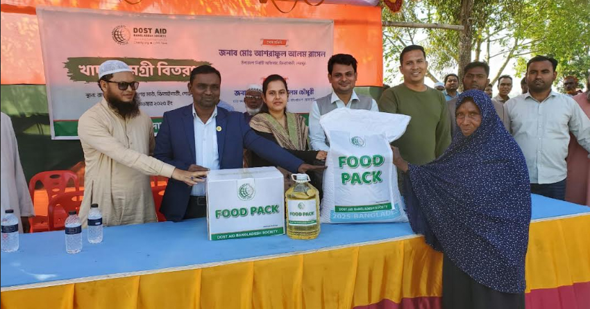 শেরপুরের ঝিনাইগাতী উপজেলার ৫০০ হতদরিদ্র পরিবারের মাঝে খাদ্যসামগ্রী বিতরণ করেছে সামাজিক স্বেচ্ছাসেবী সংস্থা দোস্ত এইড বাংলাদেশ সোসাইটি। শনিবার (২৯ নভেম্বর) সকালে উপজেলার রাংটিয়া উচ্চ বিদ্যালয় মাঠে এ খাদ্যসামগ্রী বিতরণ করা হয়। এর মধ্যে রয়েছে ২৫ কেজি চাল, ৫ লিটার সয়াবিন তেল, ৫ কেজি আলু, ২ কেজি পেঁয়াজ, ১ কেজি খেজুর, ১ কেজি রসুন, ২ কেজি ডাল, ১ কেজি মুড়ি, ১ কেজি ছোলা ও নিত্যপ্রয়োজনীয় মসলা। অনুষ্ঠানের প্রধান অতিথি উপজেলা সহকারী কমিশনার (ভূমি) অনিন্দিতা রাণী ভৌমিক, আয়োজক সংগঠনের প্রতিনিধি ও স্থানীয় স্বেচ্ছাসেবীরা উপকারভোগীদের হাতে এসব খাদ্যসামগ্রী তুলে দেন।