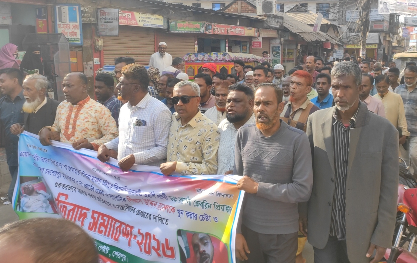 জামায়াতের কর্মীদের হামলায় শেরপুরে বিএনপি প্রার্থীর নির্বাচনী এজেন্টকে ও দৈনিক ভোরের চেতনার শেরপুর জেলা প্রতিনিধি গিয়াস উদ্দিন রাসেলকে আহত করার প্রতিবাদে বিক্ষোভ মিছিল ও সমাবেশ অনুষ্ঠিত হয়েছে।