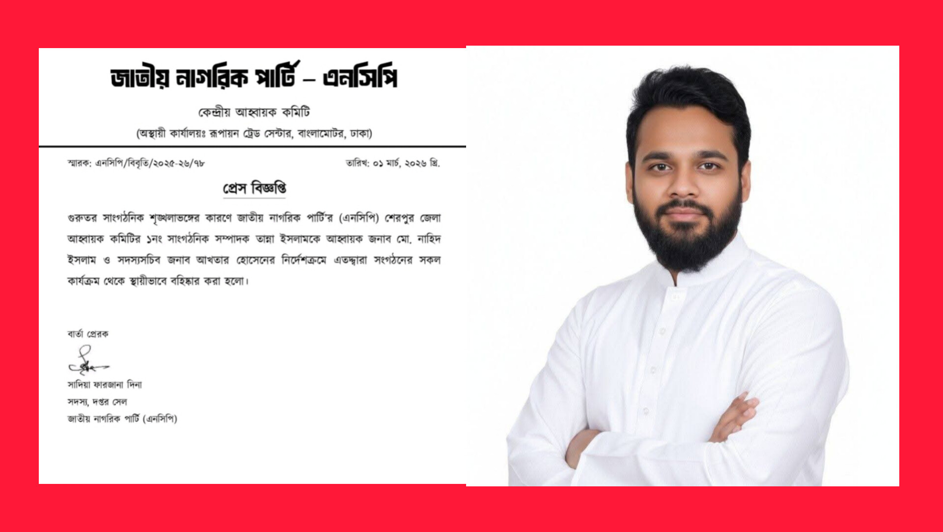 শেরপুর জেলা নাগরিক পার্টির সাংগঠনিক সম্পাদক তান্না ইসলামকে বহিষ্কার