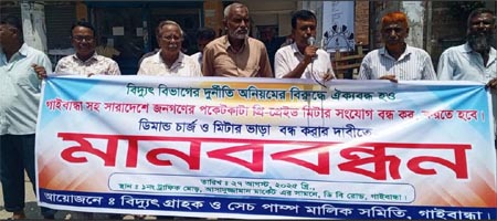 বুধবার(২৭ আগষ্ট)সকালে বিদ্যুৎ গ্রাহক ও শেচ পাম্প মালিক সমিতির গাইবান্ধা জেলা কমিটির আয়োজনে জেলা শহরের ডি বি রোডে নাট্য সংস্থার সামনে এ মানববন্ধন কর্মসূচি পালিত হয়। মানববন্ধনে বক্তারা বলেন, বিদ্যুৎ বিভাগের বিভিন্ন অনিয়ম, ঘুষ, হয়রানি এবং অবৈধ প্রিপেইড মিটার সংযোগের মাধ্যমে সাধারণ গ্রাহক ও কৃষকদের জিম্মি করে রাখা হচ্ছে।