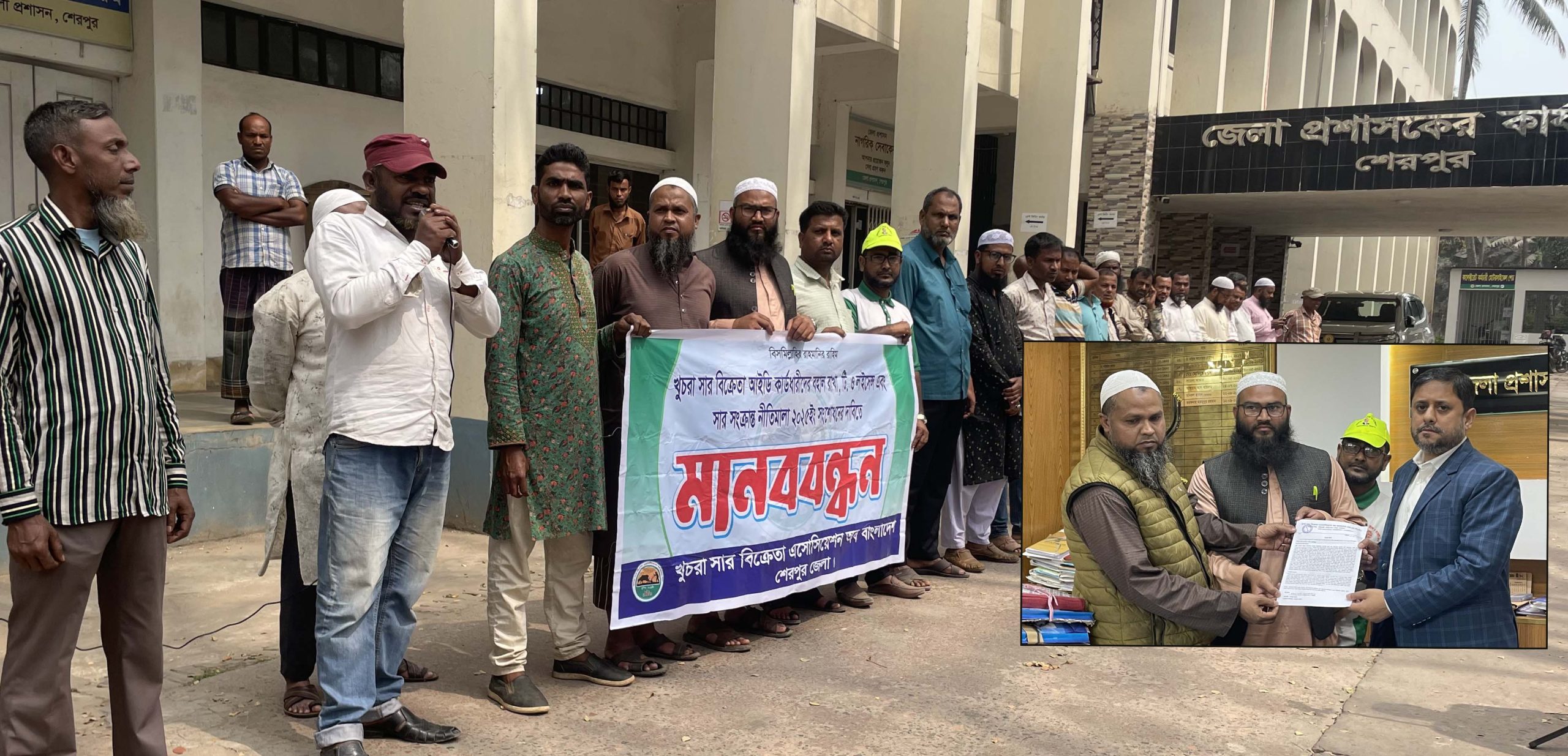 খুচরা সার বিক্রেতা আইডি কার্ডধারীদের বহাল রাখা, ট্রেড অর্গানাইজেশন (টি.ও) লাইসেন্স প্রদান এবং ‘সারসংক্রান্ত নীতিমালা ২০২৫’ সংশোধনের দাবিতে শেরপুরে মানববন্ধন অনুষ্ঠিত হয়েছে। ৩ মার্চ মঙ্গলবার দুপুরে জেলা খুচরা সার বিক্রেতা অ্যাসোসিয়েশনের উদ্যোগে জেলা প্রশাসকের কার্যালয় চত্বরে ঘণ্টাব্যাপী ওই মানববন্ধনের আয়োজন করা হয়।
