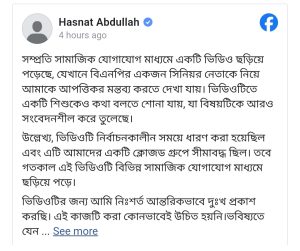 তবে গতকাল এই ভিডিওটি বিভিন্ন সামাজিক যোগাযোগ মাধ্যমে ছড়িয়ে পড়ে। ভিডিওটির জন্য আমি নিঃশর্ত আন্তরিকভাবে দুঃখ প্রকাশ করছি। এই কাজটি করা কোনোভাবেই উচিত হয়নি। ভবিষ্যতে যেন এ ধরনের অনাকাঙ্ক্ষিত ঘটনার পুনরাবৃত্তি না ঘটে এবং রাজনৈতিক পরিমণ্ডলে পারস্পরিক শালীনতা ও সৌহার্দ্য বজায় থাকে—তা নিশ্চিত করতে আমি দৃঢ় প্রতিজ্ঞ।’