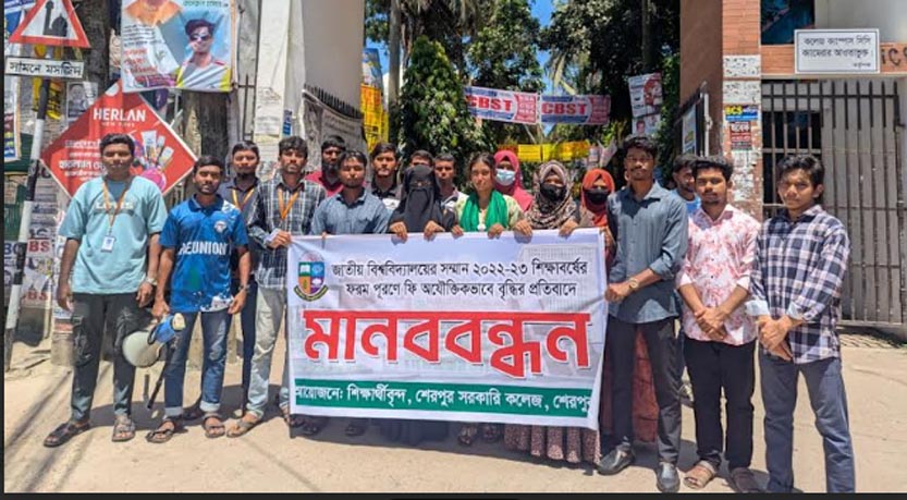 জাতীয় বিশ্ববিদ্যালয়ের ২০২২-২০২৩ শিক্ষাবর্ষের অনার্স দ্বিতীয় বর্ষ পরীক্ষার ফরম পূরণের ফি বৃদ্ধির প্রতিবাদে শেরপুর সরকারি কলেজের শিক্ষার্থীরা বিক্ষোভ মিছিল ও মানববন্ধন কর্মসূচি পালন করেছেন।